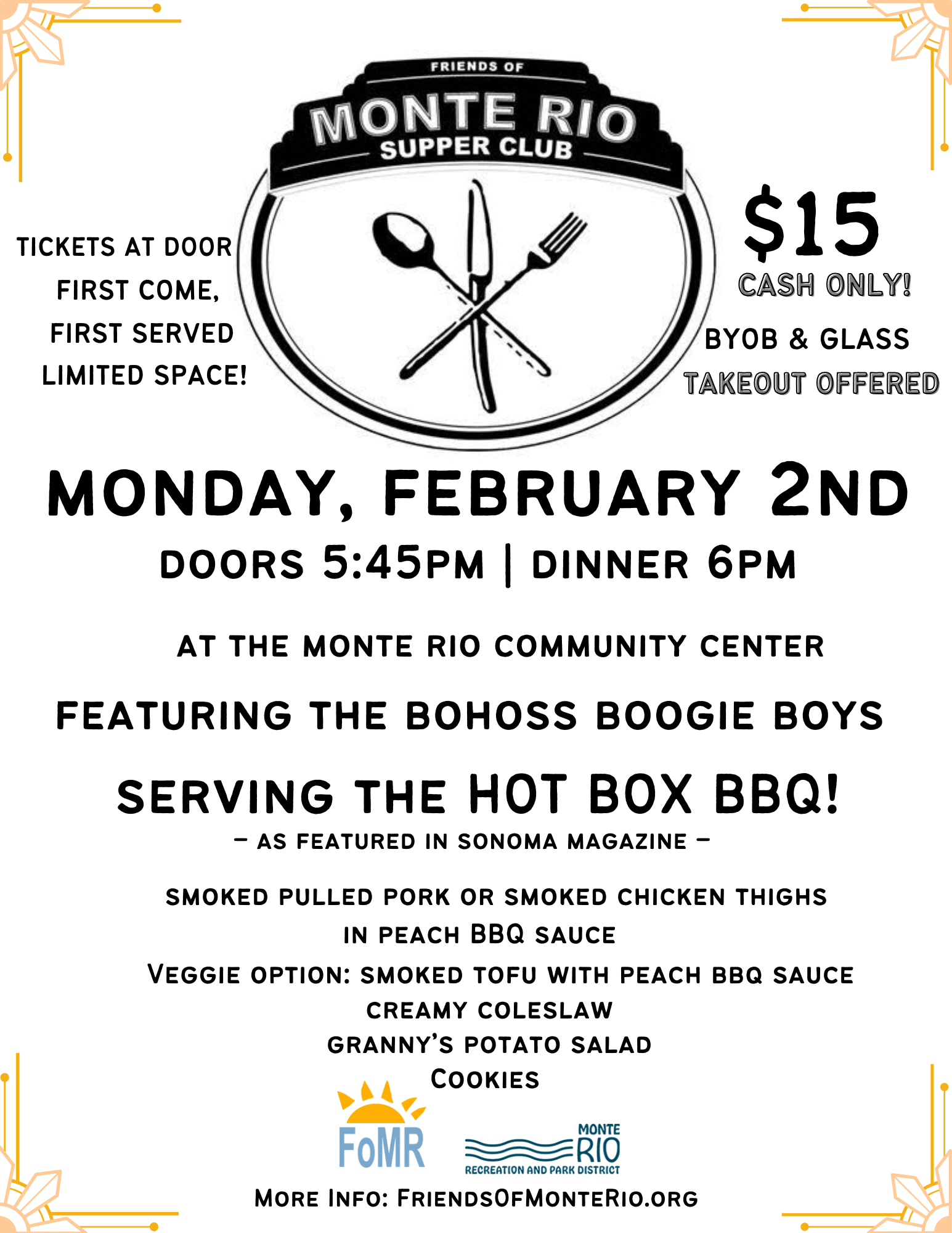 Back to All Events Supper Club Monday, February 2, 2026 5:45 PM 8:30 PM Monte Rio Community Center 20488 California 116 Monte Rio, CA, 95462 United States (map) Google Calendar ICS